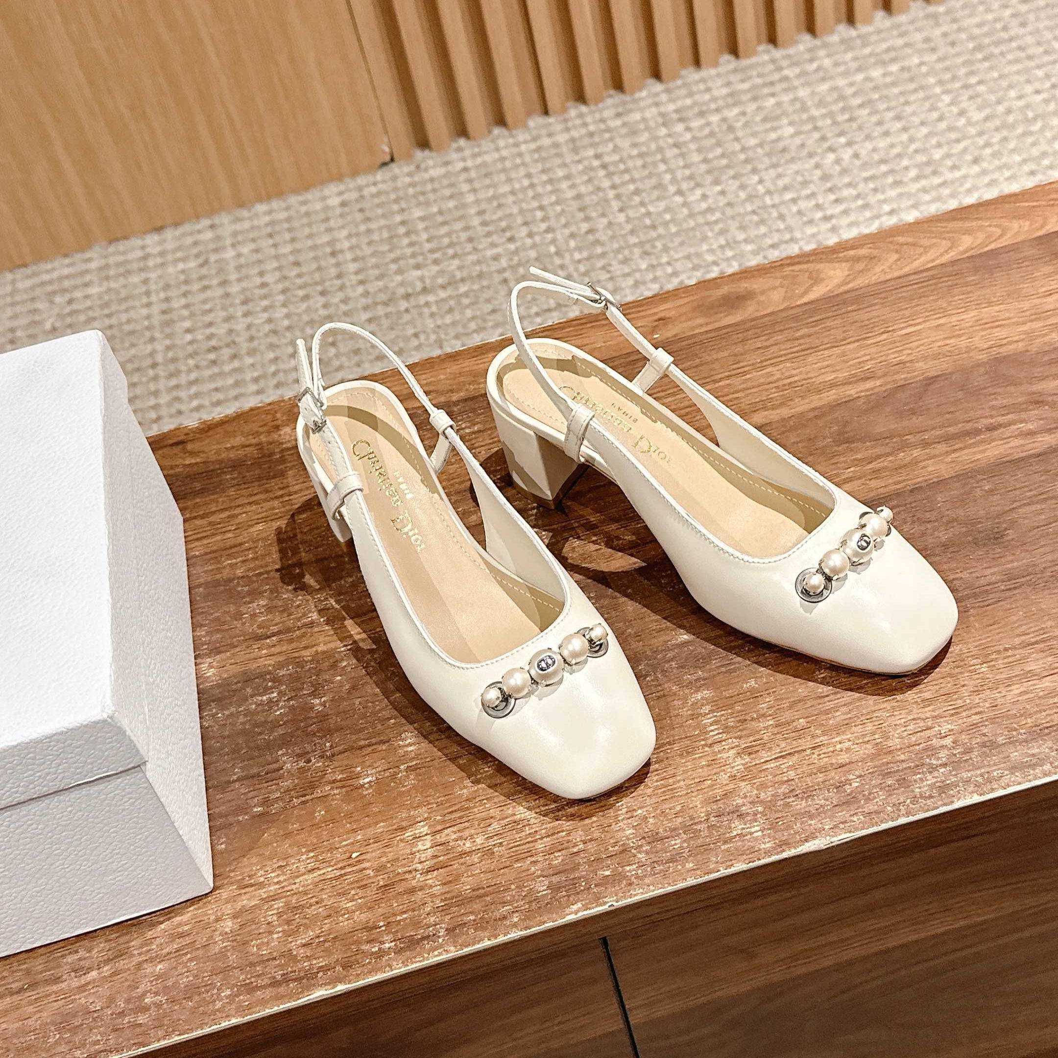 DIOR HIGH SLINGBACK 55 MM 25S IN CREAM WHITE LAMBSKIN PEARL DETAILING