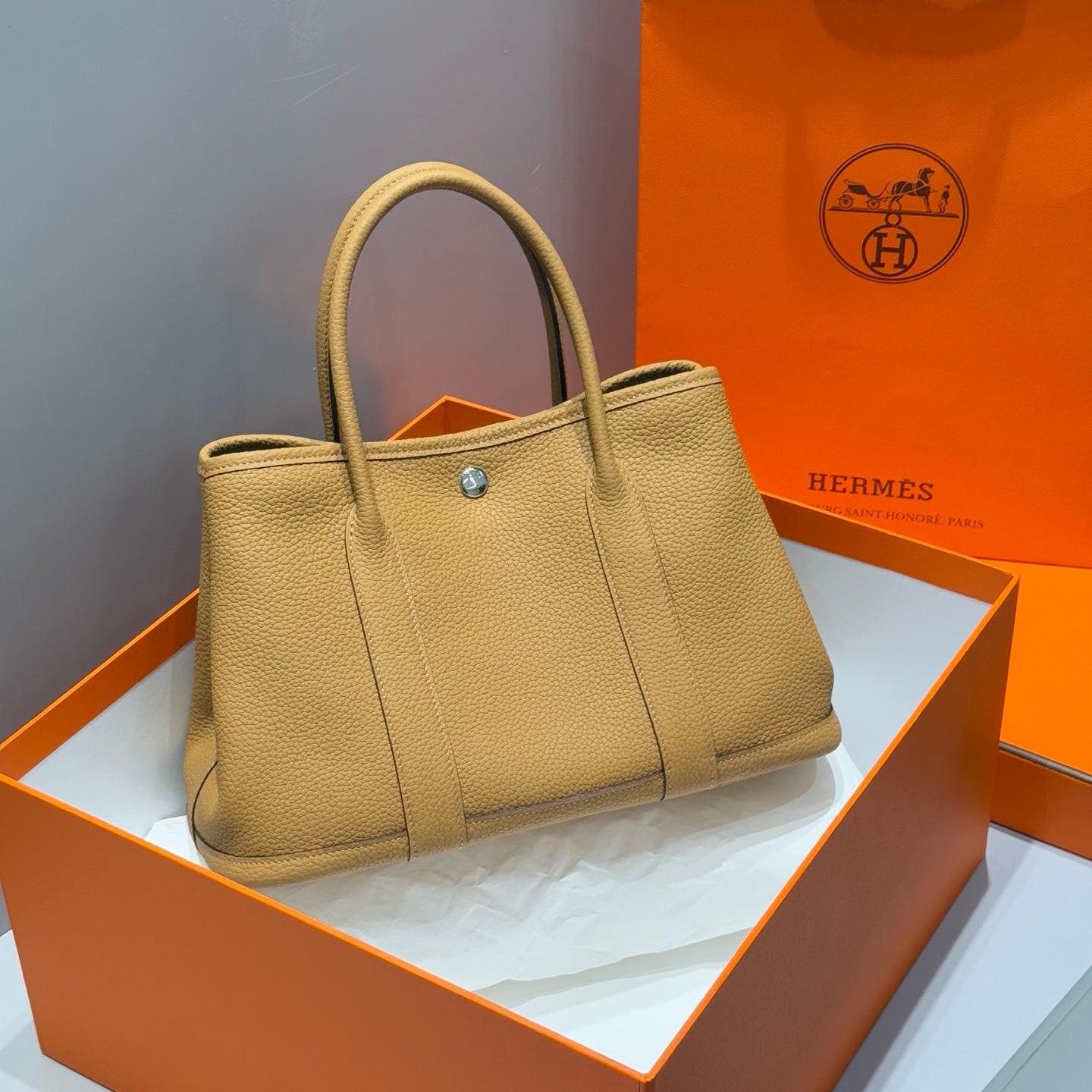 HERMES 25S GARDEN PARTY 30 IN CARAMEL CALFSKIN